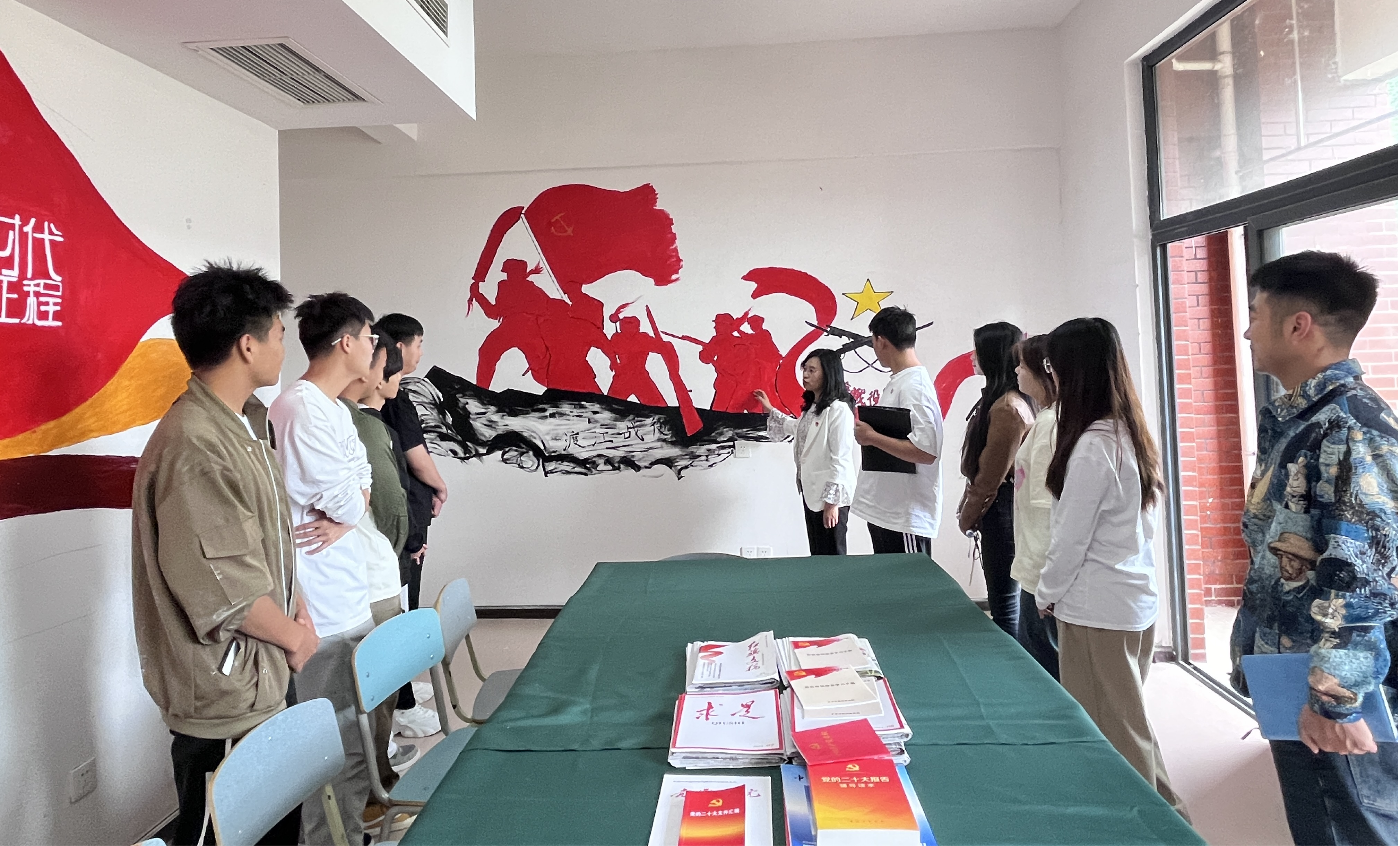 陈秀波副院长与学生党员结对,将理论与实践有机结合,一一介绍墙面上历史事件背景、经过,通过指导和生动讲解,同学们受益颇丰。陈秀波副院长勉励同学们,最好的专业教育是实践,最好的党史教育也是实践,把重大党史事件用墙绘的形式展现出来,既加深了党员同学们对历史的认识,也锻炼了同学们的专业技能。